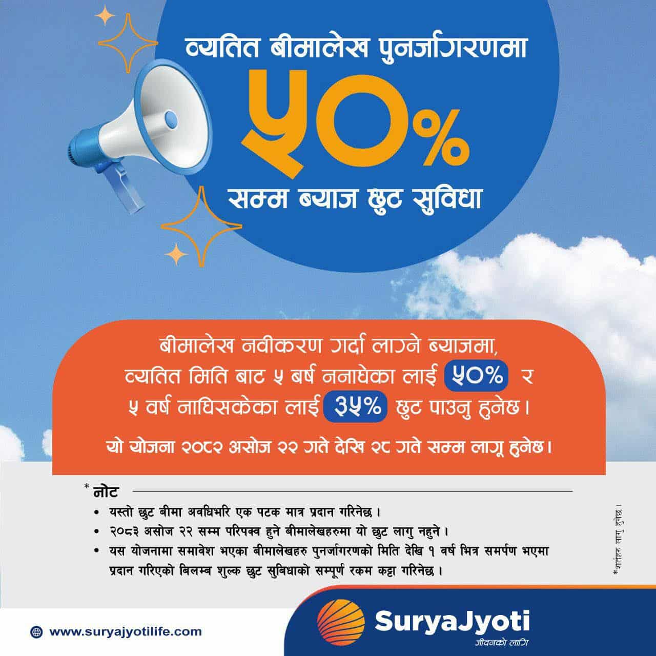 काठमाडौं । सूर्यज्योति लाइफ इन्स्योरेन्स कम्पनीले व्यतित बीमालेख पुनर्जागरण गर्दा ५० प्रतिशतसम्म ब्याज छुट दिने भएको छ। कम्पनी एक सूचना जारी गर्दै व्यतित बीमालेख नवीकरण गर्दा लाग्ने ब्याजमा ५० प्रतिशतसम्म छुट सुविधा ल्याइएको जानकारी गराएको हो।