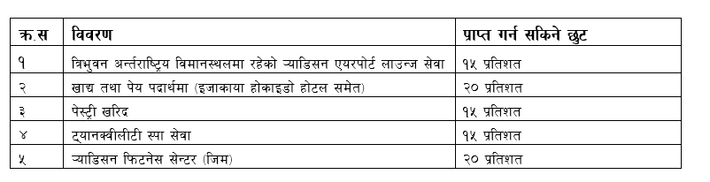 सम्झौता अन्तर्गत महालक्ष्मी विकास बैंकका डेबिट कार्ड, क्रेडिट कार्ड तथा मोबाइल बैंकिङ्ग प्रयोग गर्ने ग्राहकहरुले उक्त होटलले त्रिभुवन अन्तराष्ट्रिय विमानस्थलमा रहेको र्याडिसन एयरपोर्ट लाउन्जमा प्रदान गर्ने सेवा सहित विभिन्न सेवाहरुमा विशेष छुट प्राप्त गर्न सक्नेछन् । प्राप्त गर्न सकिने छुट निम्न लिखित रहेका छन् :