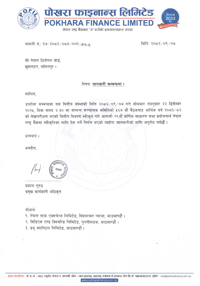 ८ पुस, २०८२काठमाडौं । पोखरा फाइनान्स लिमिटेडले गत आर्थिक वर्षको मुनाफाबाट शेयरधनीहरुलाई लाभांश वितरण नगर्ने भएको छ। बैंकको पुस ७ गते बसेको बैंकको सञ्चालक समितिको बैठकले सो निर्णय गरेको हो।