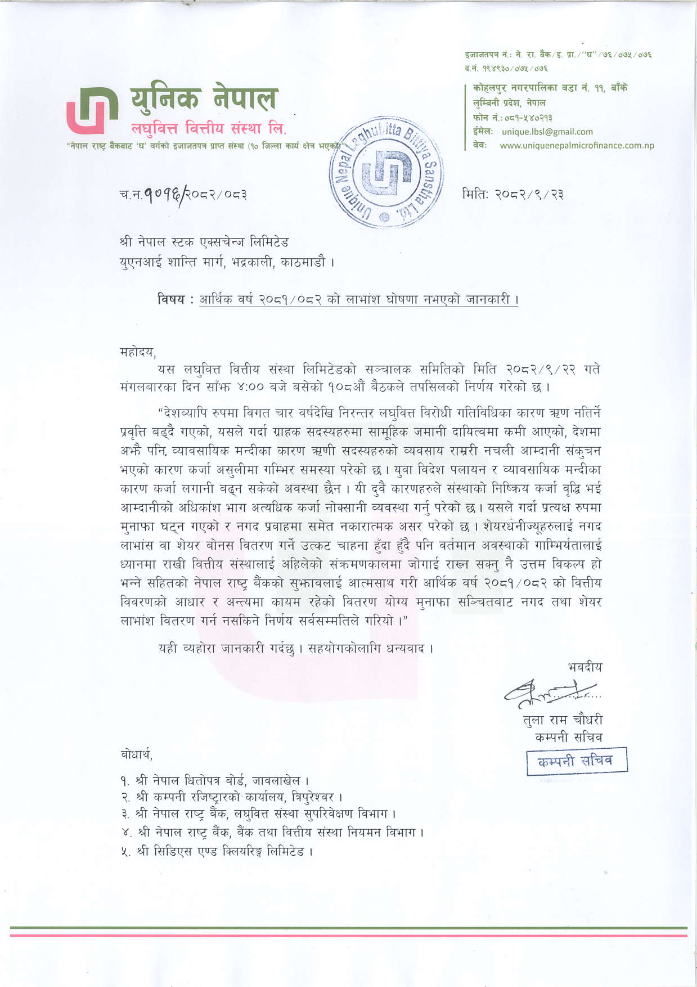 २३ पुस, २०८२काठमाडौं । युनिक नेपाल लघुवित्त वित्तीय संस्थाले शेयरधनीहरुलाई निराश बनाउने भएको छ। युनिक नेपाल लघुवित्तले गत आथिृक वर्षको नाफाबाट आफ्ना शेयरधनीलाई दिनुपर्ने लाभांश वितरण नगर्ने भएको हो। संस्थाको पुस २२ गते बसेको सञ्चालक समितिको बैठकले यस्तो निर्णय गरेको हो ।