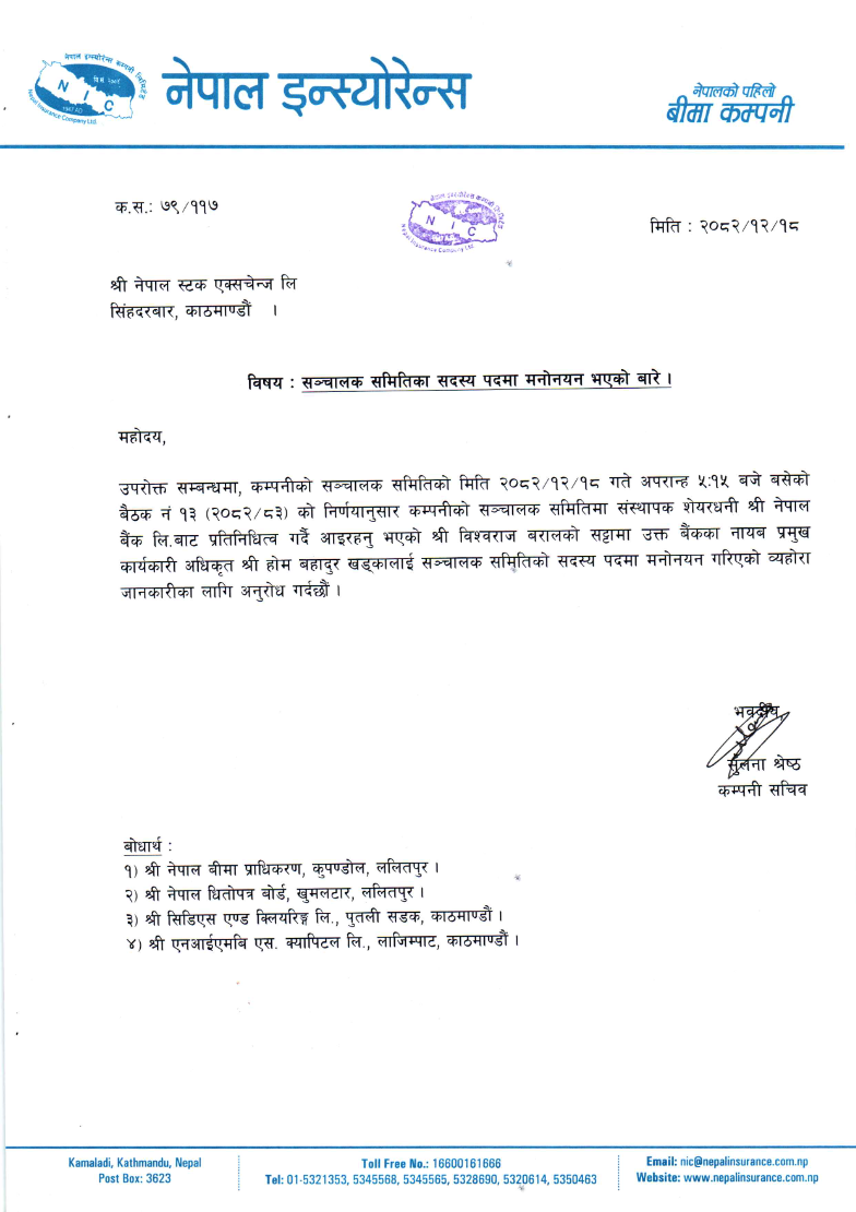 कम्पनीको चैत १८ गते बसेको सञ्चालक समितिको बैठकले सञ्चालक समितिमा संस्थापक शेयरधनी नेपाल बैंक लिमिटेडको तर्फबाट प्रतिनिधित्व गर्दै आएका सञ्चालक विश्वराज बरालको सट्टामा उक्त बैंकका डीसीईओ बराललाई नियुक्त गर्ने निर्णय गरेको हो।