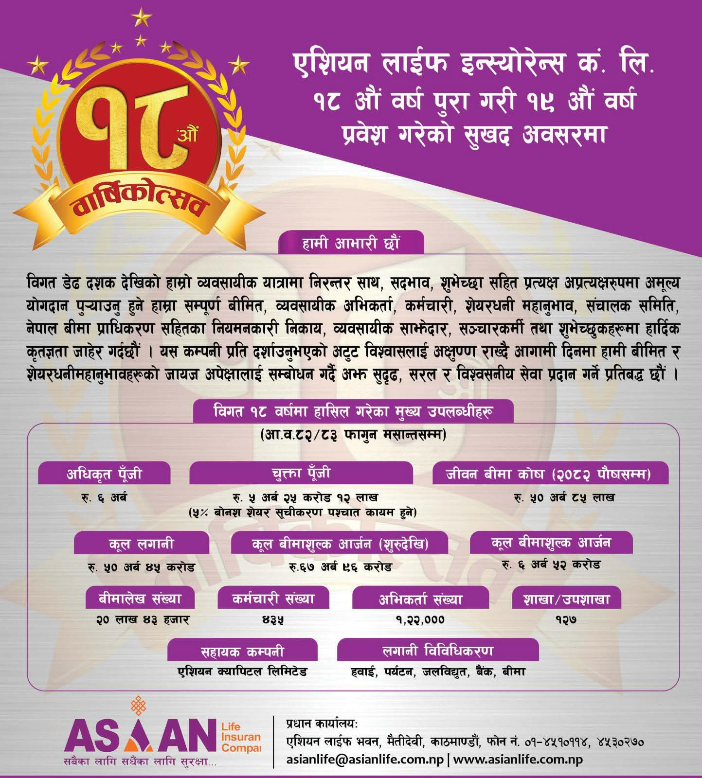 २१ चैत, २०८२काठमाडौं । एशियन लाइफ इन्स्योरेन्स कम्पनीले आफ्नो स्थापनाको १९ औँ वर्षमा प्रवेश गरेको छ। डेढ दशकभन्दा लामो व्यवसायिक यात्रा तय गरेको कम्पनीले यस सुखद् अवसरमा आफ्ना बीमित, अभिकर्ता, कर्मचारी तथा सरोकारवालाहरुलाई धन्यवाद ज्ञापन गर्दै १८ वर्षका मुख्य उपलब्धि र वित्तीय विवरणहरु सार्वजनिक गरेको छ।