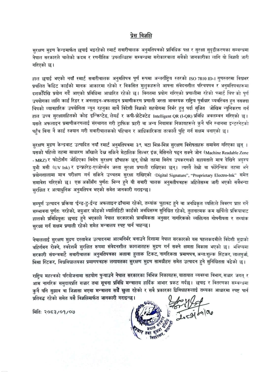 सञ्चार तथा सूचना प्रविधि मन्त्रालयले यस राष्ट्रिय महत्त्वको परियोजनामा सहयोग पु¥याउने यातायात व्यवस्था विभाग र सञ्चार जगतलाई धन्यवाद दिँदै छपाई र वितरणमा कुनै जिज्ञासा भए तथ्यका आधारमा स्पष्ट पार्न प्रतिबद्ध रहेको पनि जनाएको छ ।