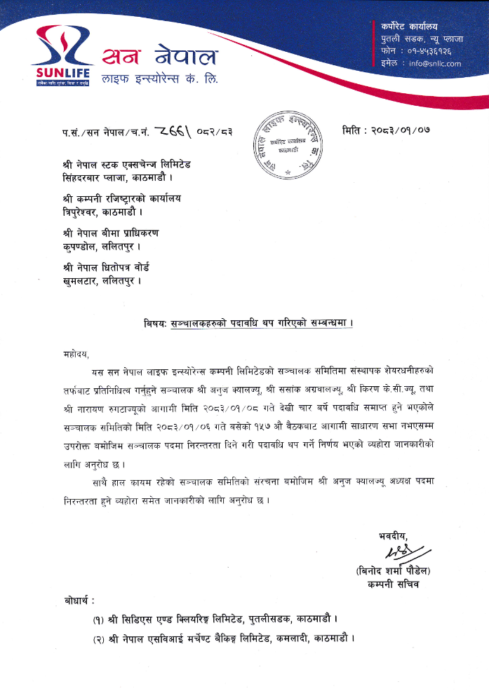 ७ बैशाख, २०८३काठमाडौं । सन नेपाल लाइफ इन्स्योरेन्स कम्पनीका संस्थापक शेयरधनीको तर्फबाट प्रतिनिधित्व गर्ने चार जना सञ्चालकहरूको पदावधि थप भएको छ। कम्पनीका सञ्चालक अनुज क्याल, ससांक अग्रवाल, किरण के.सी तथा नारायण रुगटाको चार वर्षे पदावधि २०८३ वैशाख ८ गतेबाट समाप्त हुने भएकोले आगामी वार्षिक साधारणसभा नभएसम्मका लागि समय थप गरिएको जनाएको छ ।